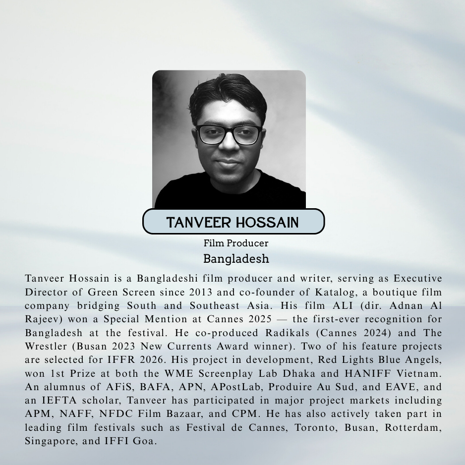 From the submitted projects, the top 10 proposals will be selected for an exclusive mentorship program. Over four days, these participants will engage in an intensive workshop designed to refine their screenplays and develop their projects under the guidance of experienced mentors. Each participant will work closely with a dedicated mentor for the first three days, receiving personalized feedback and advice. On the final day, the participants will pitch their projects through >online at FilmHaat, the festival’s marketplace, where producers, distributors, investors, and OTT platforms will be present.
