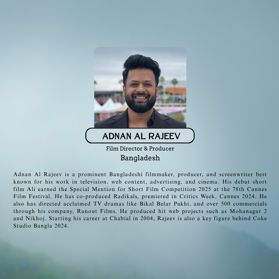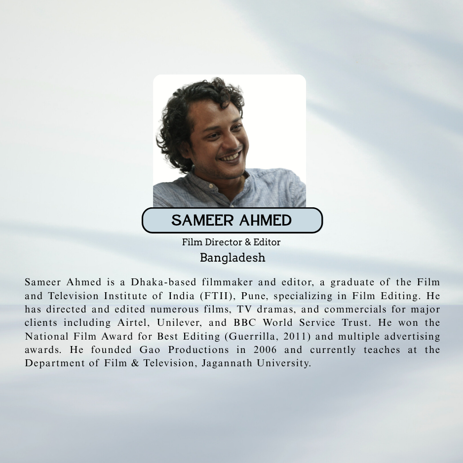 Sadia Khalid Reeti studied Screenwriting at the University of California, Los Angeles (UCLA). Currently the Showtime Editor of Dhaka Tribune, Sadia served as a jury member at international film festivals in Italy, India, England, Iran, Nepal, France, Russia, Sri Lanka and Bangladesh. She served as a FIPRESCI jury at Cannes, Kerala, Bengaluru and Dhaka. She is the first international voter for the Golden Globe Awards from Bangladesh. She attended mentorship programs like Berlinale Talents, Film Independent, Locarno Open Doors and British Council’s Charles Wallace Fellowship. Co-convener of West-Meets-East Screenplay Lab and Film Haat, she also teaches screenwriting at different universities.